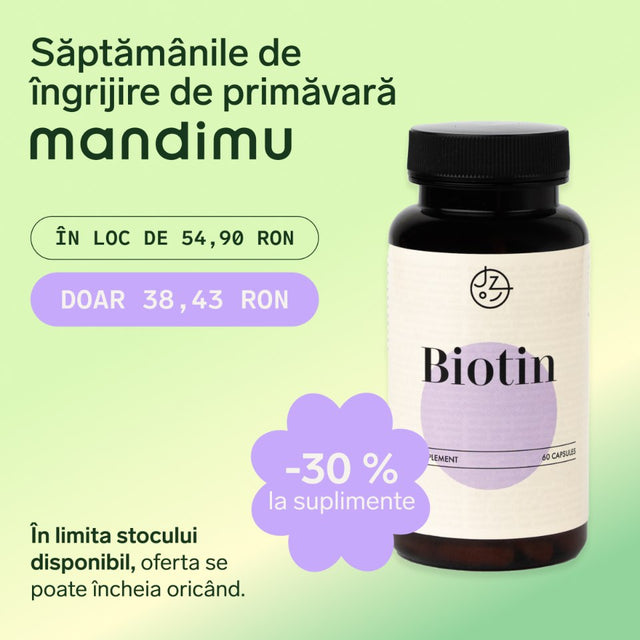 Biotina, vitamina B7 sau numită și vitamina H joacă un rol cheie în a menține părul și pielea sănătoase. Datorită efectelor sale benefice asupra aspectului tineresc și energic, i se mai spune și vitamina frumuseții. Totuși, efectele sale depășesc domeniul estetic – biotina este benefică și stării generale de sănătate, atât asupra stării fizice, cât și a celei psihice.
